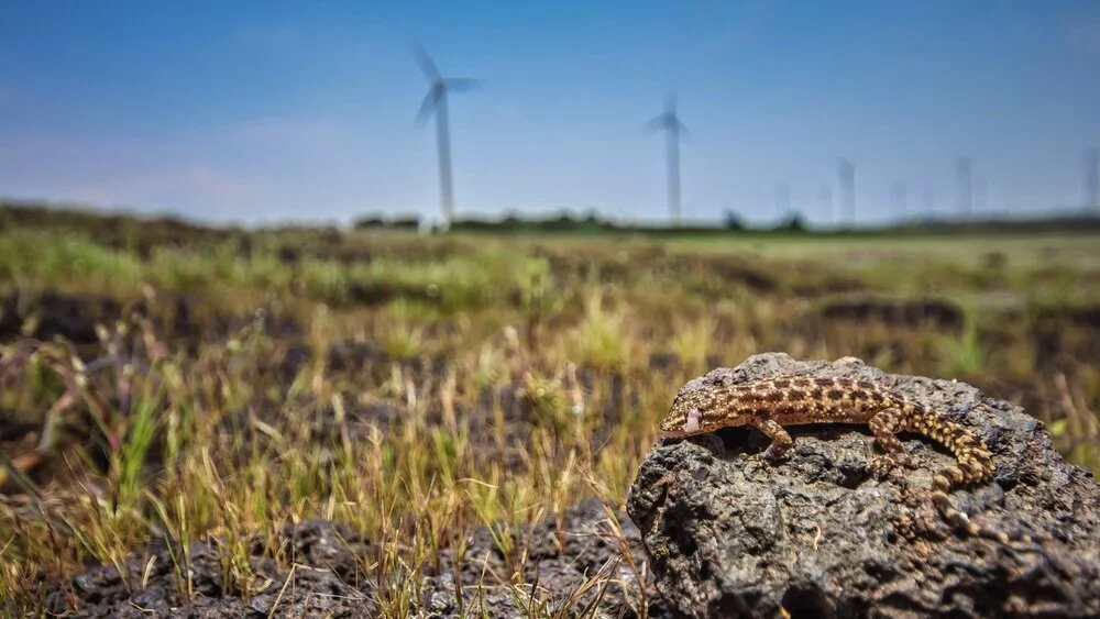 On my last evening here, a group of 20 odd wildlife photographers came looking for geckos and snakes. The moment they saw all the cables and windmills, they tucked their wide angle lenses into their bags and began photographing with their macro lenses. I don't disagree about the aesthetic value of a closeup wildlife photograph. I wish though, that more people cared about telling the story as they see it. Windmills however are an undeniable part of the habitat here and so it made sense to show them to you in this image of a Brook's House Gecko (Hemidactylus brookii). I hope it tells you a bit more about the existence of wildlife in such habitats.